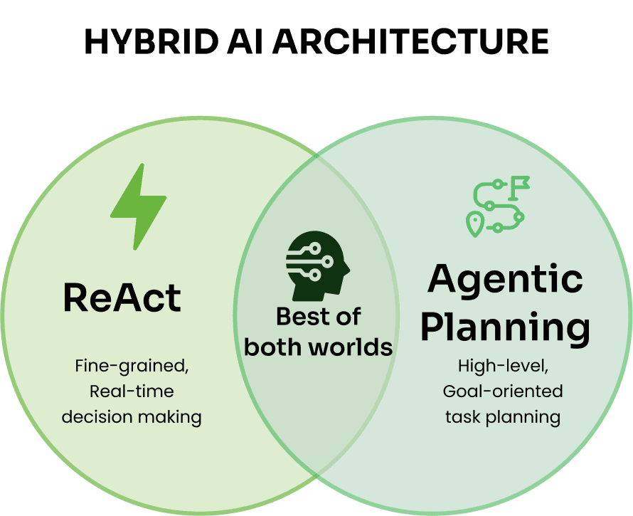 Hybrid planning systems combine the strategic rigor of Agentic Planning with the contextual agility of ReAct. This dual-mode framework empowers AI agents to operate with a clear long-term objective while adjusting dynamically to real-time enterprise signals—from changing data environments to unexpected user inputs.