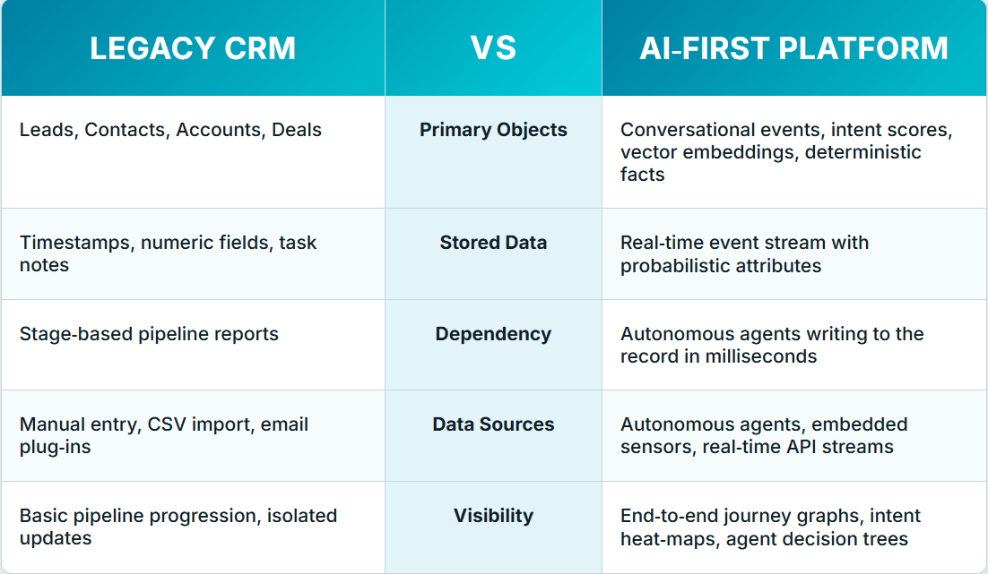 In the 1990s a CRM was revolutionary because it centralized rolodexes and sticky notes. In the 2000s integrations and APIs made it a hub for email and call logs. Today the revolution is conversational and probabilistic, driven by agents that learn and act continuously. To harness that power, we must rethink what it means to be a “system of record.” The next generation will not merely store who did what and when; it will capture why decisions were made, how prospects felt, and which conversational cues predicted success. Those insights will fuel even smarter agents, closing the loop between data and action in ways legacy CRMs were never built to handle.